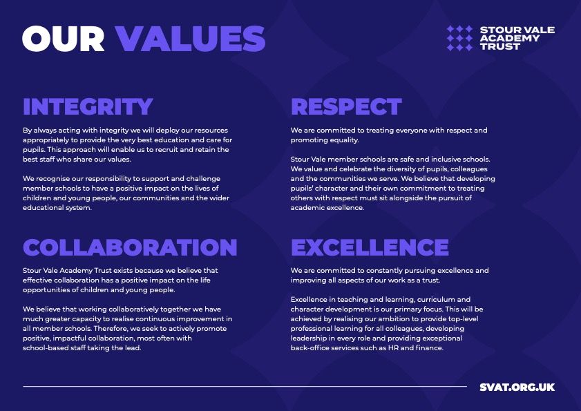 Looking to the future, our vision is to be a larger, more successful and more diverse family of schools and settings. Stour Vale member schools and settings will serve their communities by providing the excellent education and care which ensures both strong academic progress and a broad range of opportunities for personal development. Both individually and collectively, member schools and settings will also have a significant positive impact on the wider education system.